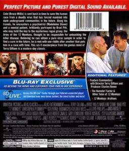 In the year 2035, convict James Cole volunteers reluctantly to be sent back in time by scientists to discover the origin of a deadly virus that wiped out nearly all of the earth's population decades earlier. But when Cole is sent mistakenly to 1990 instead of 1996, he's arrested and locked up in a mental hospital, where he meets a psychiatrist and the son of a famous virus expert. |