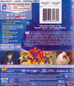 Big Hero 6 contains a fairly brief assortment of extras. Inside the Blu-ray case, buyers will find a DVD copy of the film and a voucher for an iTunes digital copy. •Theatrical Short: Feast (1080p, 6:13): A cute little short animated film from Director Patrick Osborne that follows a little dog with a big appetite and an eye towards the future. •The Origin of Big Hero 6: Hiro's Journey (1080p, 15:10): Jamie Chung hosts a look at building the film from the original Marvel comic and blending that with Disney animation, changes from the original source material, real life influences that defined the film, the core development processes, character qualities, developing Baymax, crafting the film's unique but identifiable environment, new technologies utilized in the film's construction, the film's villain, the picture's emotional core, and more. •Big Animator 6: The Characters Behind the Characters (1080p, 6:39): A short "roundtable" discussion between some of the creative minds that worked on the film. They discuss what they do, how they do it, influences, and some of the deeper technical details of the job. •Deleted Scenes with Introductions by Directors Don Hall & Chris Williams (1080p): Alternate Opening -- Prologue (4:05), Alternate Opening -- Silent Sparrow (4:53), Yokai's Crew (2:42), and "Every Great Super Hero Origin Story Starts with a Grappling Hook" (1:12). •Big Hero 6 Theatrical Trailer (1080p, 1:41). DVD Copy |