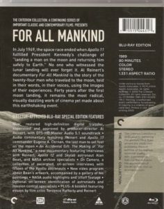 Audio commentary featuring Reinert and Apollo 17 commander Eugene A. Cernan An Accidental Gift: The Making of For All Mankind On Camera: A collection of excerpted on-screen interviews with fifteen of the Apollo astronauts New video program about Bean’s artwork NASA audio highlights and liftoff footage Optional on-screen identification of astronauts and mission control specialists Plus: A booklet featuring essays by film critic Terrence Rafferty and Reinert