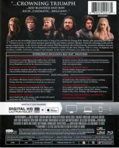 Special Features Avaialable On Disc 1: -Audio Commentaries for: "Winter is Coming" with executive producers/writers David Benioff & D.B. Weiss and "The Kingsroad" with Lena Headey (Cersei Lannister), Mark Addy (Robert Baratheon) and Nikolaj Coster-Waldau (Jaime Lannister -In-Episode Guides (Blu-ray Exclusive, HD): Each episode offers an interactive guide that provides on-screen pop-up facts about the characters, locations, and histories featured in Game of Thrones. Click on the "Complete Guide" button and dig a little deeper, which pauses the episode you're viewing and allows access to "The Complete Guide to Westeros" which is a wealth of magnificently produced content. (See the next area) -The Complete Guide to Westeros ((Blu-ray Exclusive, HD): The "Complete Guide," also accessible from the disc's main menu, includes interactive maps, family histories and, twenty-four mini-featurettes (well over an hour's worth, all presented in HD) that explore the mythologies, lore, religious beliefs, warring factions, lands, ancestries and monumental events alluded to, referenced in or more fully examined by the series itself. The striking artwork and extensive information in each one are worth the price of admission alone; the fact that the videos are narrated by various members of the cast (narrating in character no less) is just icing on the cake. -Character Profiles (HD, 31 minutes): Profiles of fifteen characters -- Ned, Robb, Arya, Bran, Sansa and Catelyn Stark; Cersei, Jaime and Tyrion Lannister; Daenerys and Viserys Targaryen; and Jon Snow, Khal Drago, Petyr Baelish and Robert Baratheon -- as described by the actors themselves. Special Features Avaialable On Disc 2: -Audio Commentaries for: "Lord Snow" with Sophie Turner (Sansa Stark), Maisie Williams (Arya Stark) and Isaac Hempstead Wright (Bran Stark) and "Cripples, Bastards and Broken Things" with writer Bryan Cogman and Kit Harington (Jon Snow) -In-Episode Guides (Blu-ray Exclusive, HD): Each episode offers an interactive guide that provides on-screen pop-up facts about the characters, locations, and histories featured in Game of Thrones. Click on the "Complete Guide" button and dig a little deeper, which pauses the episode you're viewing and allows access to "The Complete Guide to Westeros" which is a wealth of magnificently produced content. (See the next area) -The Complete Guide to Westeros (Blu-ray Exclusive, HD): The "Complete Guide," also accessible from the disc's main menu, includes interactive maps, family histories and, twenty-four mini-featurettes (well over an hour's worth, all presented in HD) that explore the mythologies, lore, religious beliefs, warring factions, lands, ancestries and monumental events alluded to, referenced in or more fully examined by the series itself. The striking artwork and extensive information in each one are worth the price of admission alone; the fact that the videos are narrated by various members of the cast (narrating in character no less) is just icing on the cake. Special Features Avaialable On Disc 3: -Audio Commentaries for "A Golden Crown" with director Daniel Minahan, Peter Dinklage (Tyrion Lannister), Emilia Clarke (Daenerys Targaryen) and Harry Lloyd (Viserys Targaryen) -In-Episode Guides ( Blu-ray Exclusive, HD): This episode offers an interactive guide that provides on-screen pop-up facts about the characters, locations, and histories featured in Game of Thrones. Click on the "Complete Guide" button and dig a little deeper, which pauses the episode and allows access to "The Complete Guide to Westeros" which is a wealth of magnificently produced content. (See the next area) -The Complete Guide to Westeros (Blu-ray Exclusive, HD): The "Complete Guide," also accessible from the disc's main menu, includes interactive maps, family histories and, twenty-four mini-featurettes (well over an hour's worth, all presented in HD) that explore the mythologies, lore, religious beliefs, warring factions, lands, ancestries and monumental events alluded to, referenced in or more fully examined by the series itself. The striking artwork and extensive information in each one are worth the price of admission alone; the fact that the videos are narrated by various members of the cast (narrating in character no less) is just icing on the cake. -Anatomy of an Episode: A Golden Crown (HD, 61 minutes): Thrones' sixth episode boasts a Maximum Movie Mode-esque Picture-in-Picture track, complete with cast and crew interviews, behind-the-scene footage and plenty more. Special Features Avaialable On Disc 4: -Audio Commentaries for "The Pointy End" with co-executive producer/author George R.R. Martin -In-Episode Guides (Blu-ray Exclusive, HD): Each episode offers an interactive guide that provides on-screen pop-up facts about the characters, locations, and histories featured in Game of Thrones. Click on the "Complete Guide" button and dig a little deeper, which pauses the episode you're viewing and allows access to "The Complete Guide to Westeros" which is a wealth of magnificently produced content. (See the next area) -The Complete Guide to Westeros (Blu-ray Exclusive, HD): The "Complete Guide," also accessible from the disc's main menu, includes interactive maps, family histories and, twenty-four mini-featurettes (well over an hour's worth, all presented in HD) that explore the mythologies, lore, religious beliefs, warring factions, lands, ancestries and monumental events alluded to, referenced in or more fully examined by the series itself. The striking artwork and extensive information in each one are worth the price of admission alone; the fact that the videos are narrated by various members of the cast (narrating in character no less) is just icing on the cake. Special Features Avaialable On Disc 5: -Audio Commentaries for "Fire and Blood" with David Benioff & D.B.Weiss and director Alan Taylor. -In-Episode Guides (Blu-ray Exclusive, HD): This episode offers an interactive guide that provides on-screen pop-u