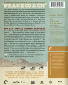 - Audio commentary by western authority Jim Kitses (Horizons West). - Bucking Broadway, a 1917 silent feature by John Ford, with new music composed and performed by Donald Sosin. - Journalist and television presenter Philip Jenkinson's extensive 1968 video interview with Ford. - New video appreciation of Stagecoach, with director and Ford biographer Peter Bogdanovich. - New video interview with Ford's grandson, Dan Ford about the director and his home movies. - New video piece, featuring journalist Buzz Bissinger, about trader Harry Goulding's key role in bringing Monument Valley to Hollywood. - New video homage to legendary stuntman Yakima Canutt, with celebrated stunt coordinator Vic Armstrong. - Video essay by writer Tag Gallagher analyzing Ford's visual style in Stagecoach. - Screen Director's Playhouse 1949 radio dramatization of Stagecoach, with John Wayne, Claire Trevor, and Ford, downloadable as an MP3 file. - Theatrical trailer. |